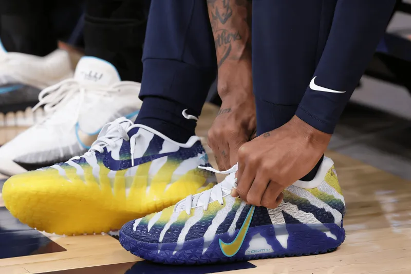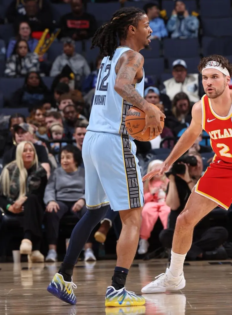 比赛中,莫兰特上脚母校莫瑞州立大学配色Nike JA3“Murray State University”。