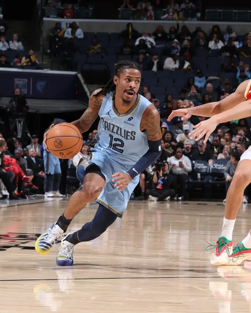 比赛中,莫兰特上脚母校莫瑞州立大学配色Nike JA3“Murray State University”。